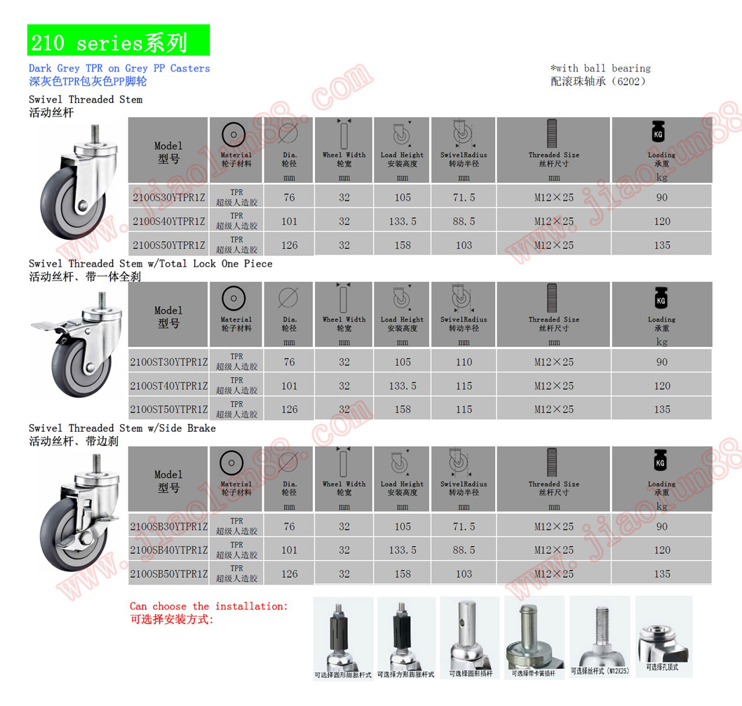 ◆ 產(chǎn)品規(guī)格:萬(wàn)向、固定、絲桿、萬(wàn)向帶雙剎(同時(shí)鎖住支架和輪子)、孔頂、插桿、膨脹式。